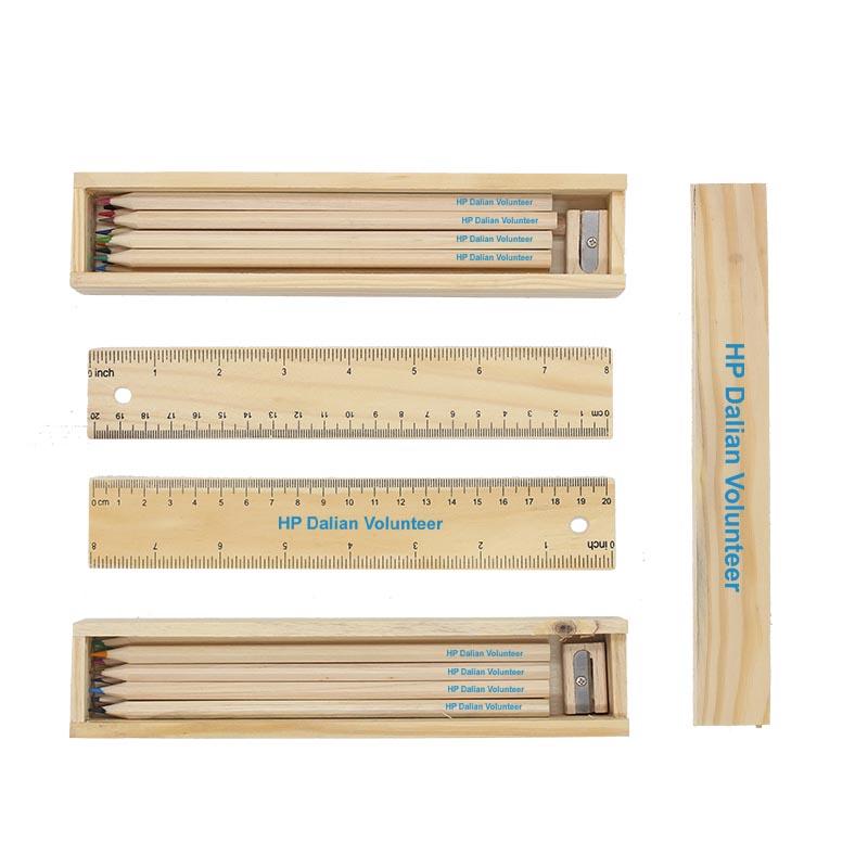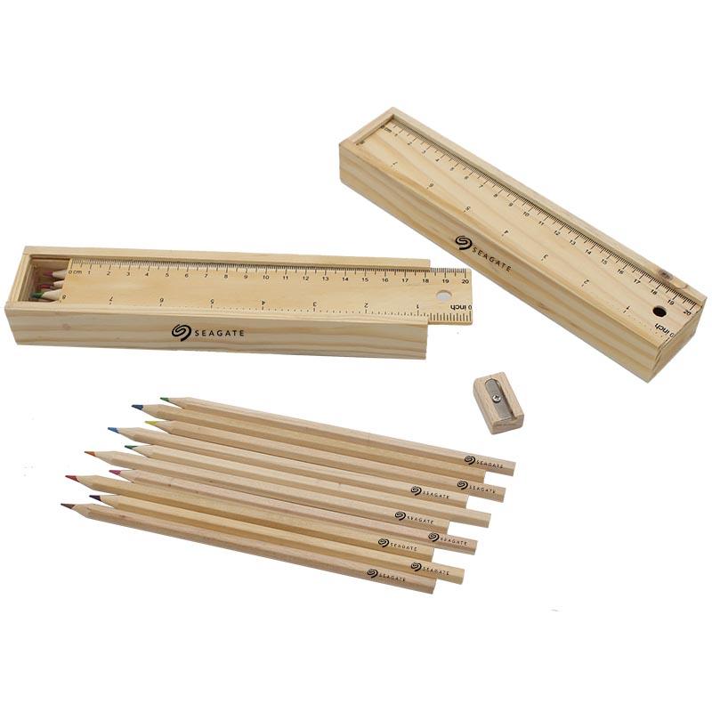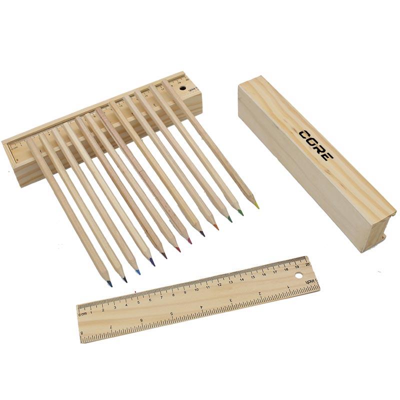 Set of 12 colour pencils and sharpener set in wooden box. Includes pull-out cover designed as a ruler.