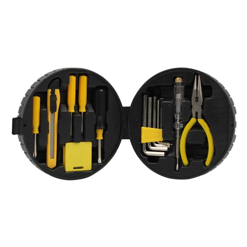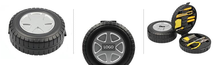 15-piece car tool kit in flip-open case in the shape of a tyre.