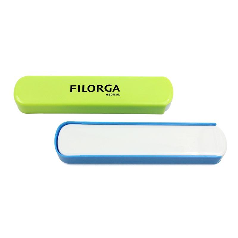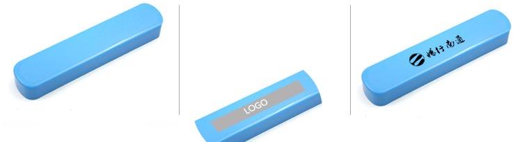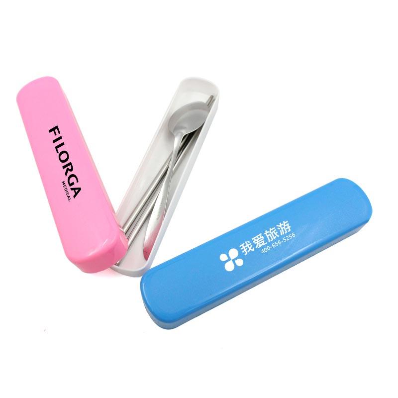 2-piece cutlery set in slide-open rectangular plastic case. Includes metal spoon and chopsticks.