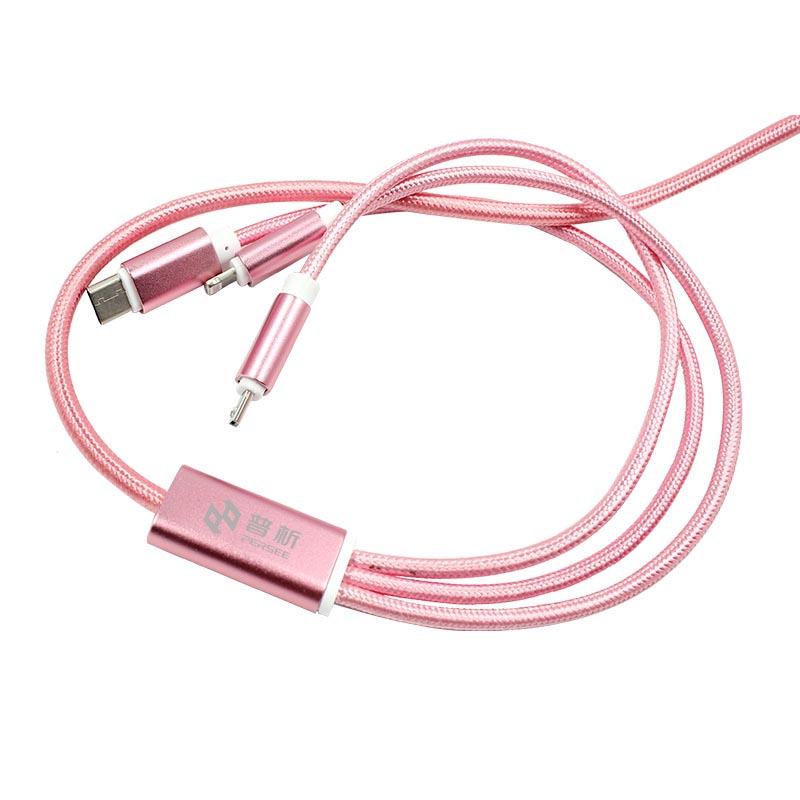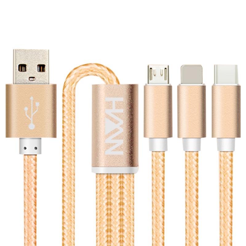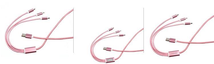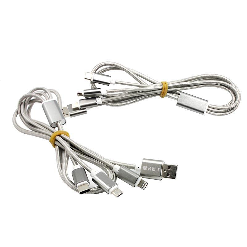 3-in-1 aluminium alloy charging cable set. Includes 3 cable types and USB connector.