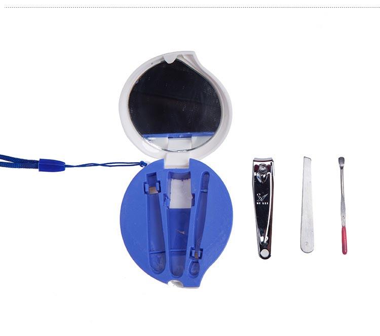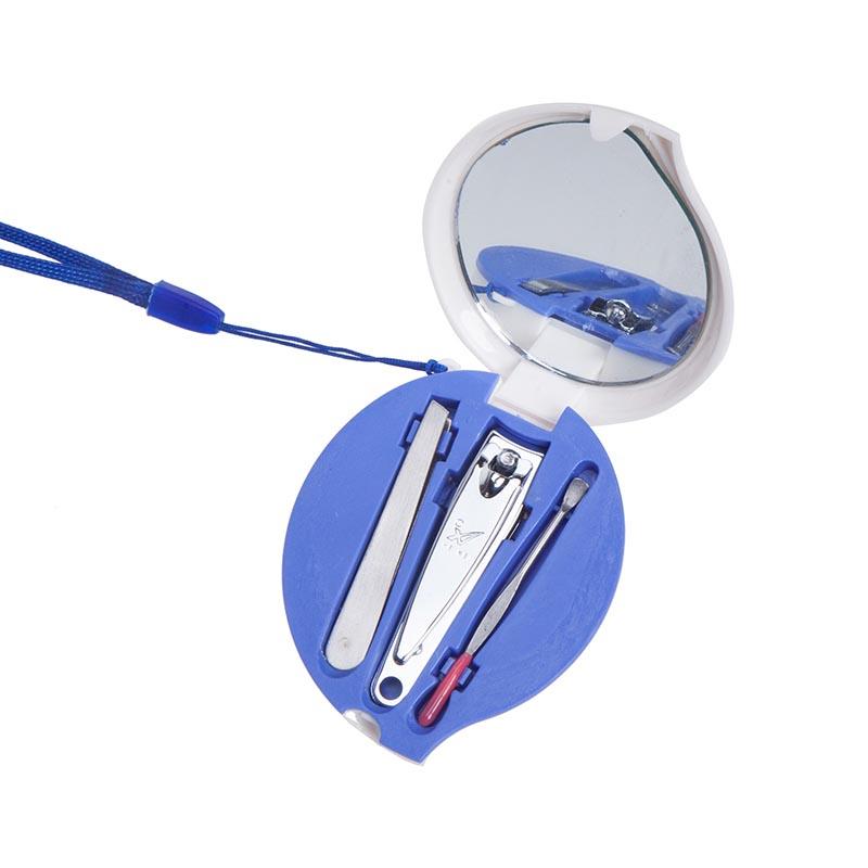 3-piece manicure set in waterdrop-shaped case. includes mirror, nail clipper, nail cleaner and tweezers.