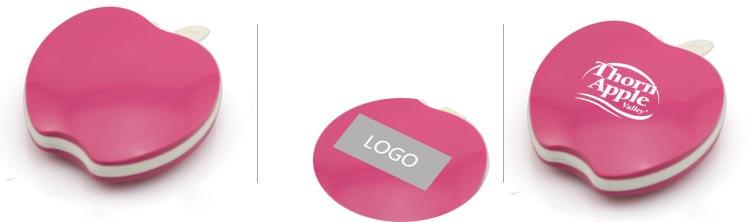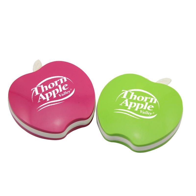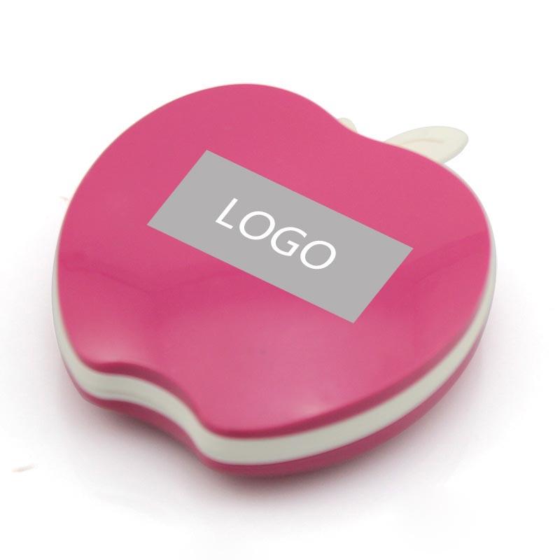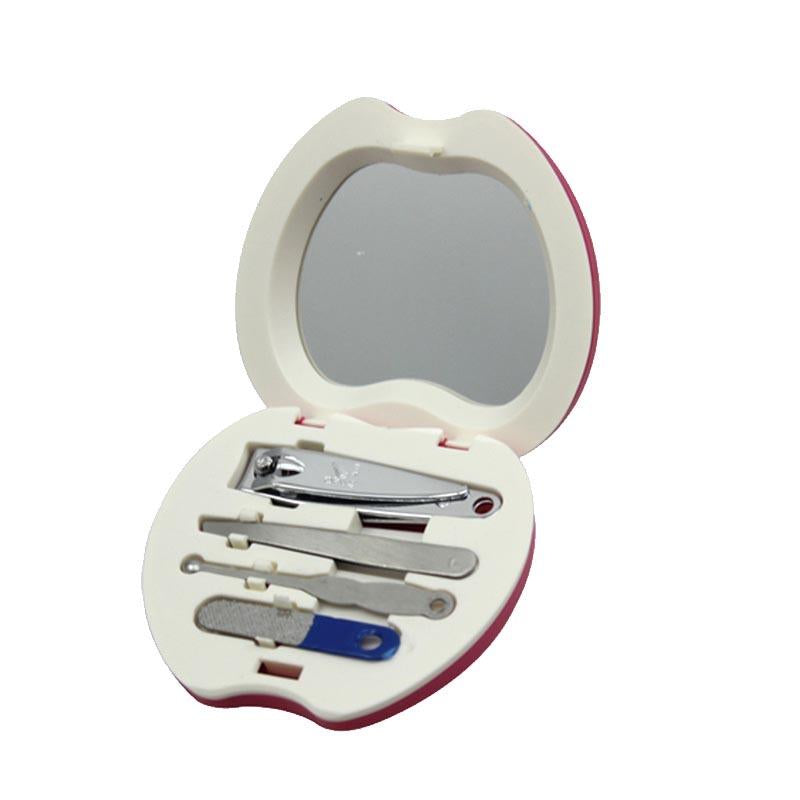 4-piece manicure set in case the shape of an apple. Includes flip-open top and mirror.