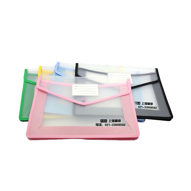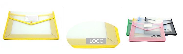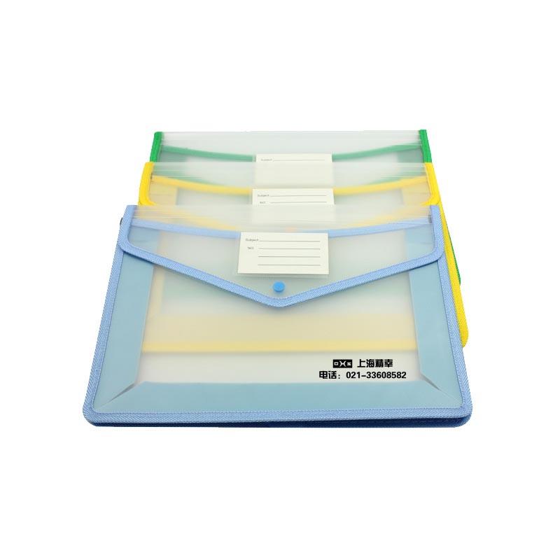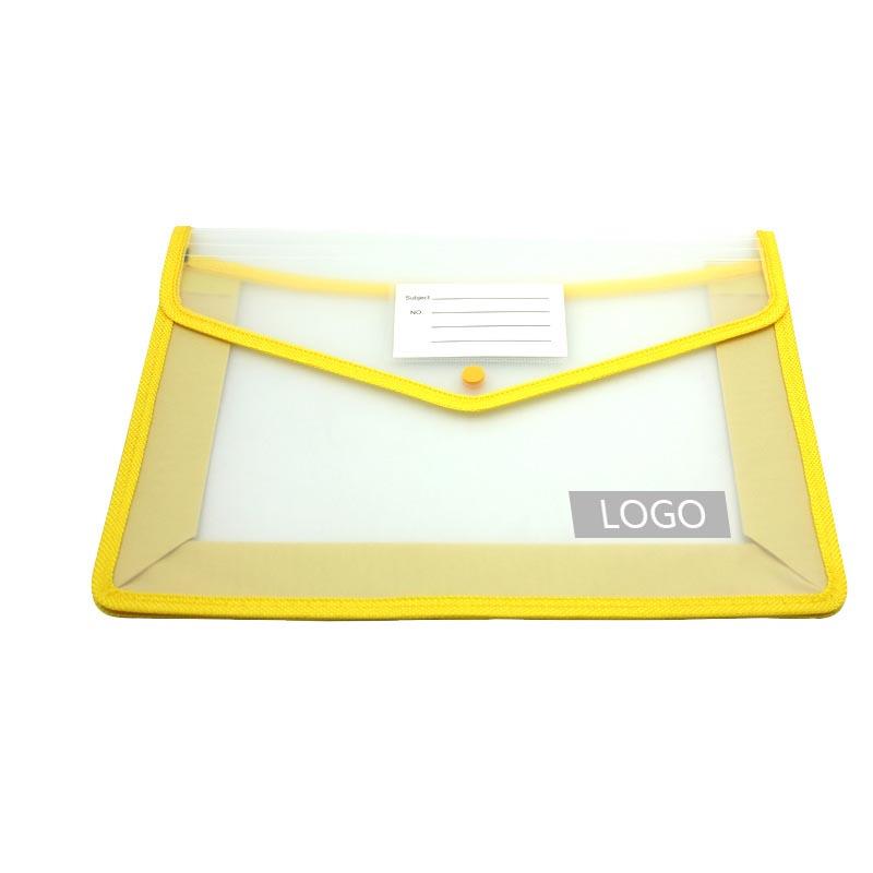 A4 clear document pouch with coloured edge, triangular flap closure with snap fastener.
