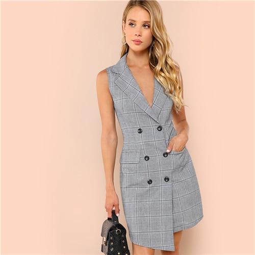 SHEIN Black and White Elegant Notch Collar Double Breasted Surplice Wrap Dress 2018 Summer Slim Modern Lady Women Dresses