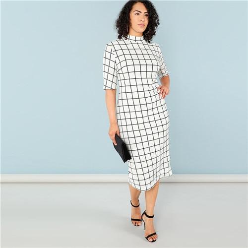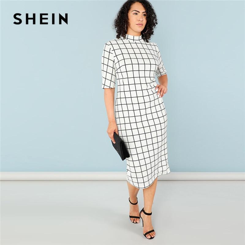 SHEIN Elegant Plaid Bodycon Plus Size Long Pencil Dresses Womens 2018 Office Lady Stand Collar Grid Print Slim Fit Dress