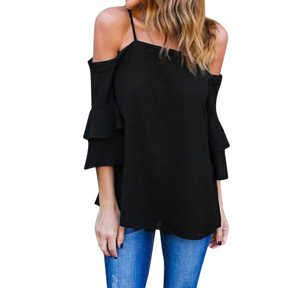 Women Off Shoulder Tank Top Bell Sleeve Loose Casual Shirt Blouse